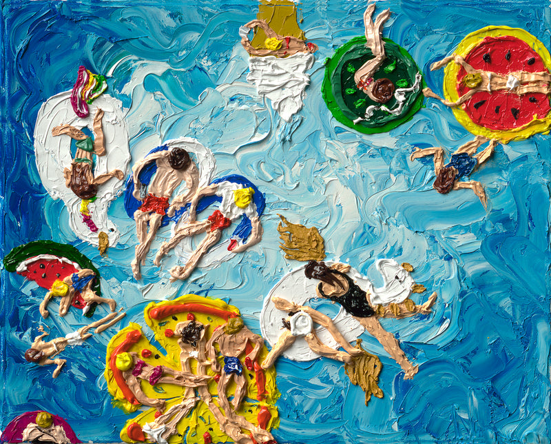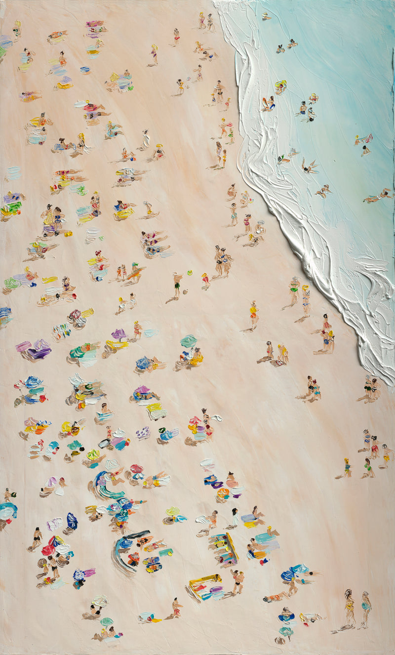 A central motif in her work is the beach and the ocean, often depicted from a drone-like perspective. These compositions are intentionally minimal — built from dots, strokes, and texture — allowing the viewer’s imagination to complete the scene. Through this approach, Alina seeks to evoke feather-light summer moods, joy of life, and a sense of freedom. Her art is meant to be felt rather than explained, bringing joy, memories, and warmth into new homes.